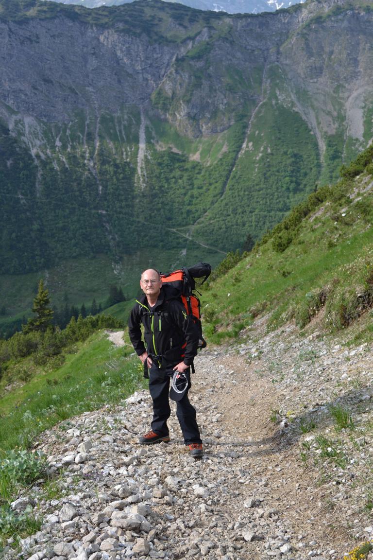 After a very pleasant stay at the Mindelheimer Cabin and having a great evening with a small group of hikers from the German Saarland, who would follow us the next few days, we set out at 09.00 on a comparatively easy descent towards the end of the Rappenalp valley. After only a few yards, we were able to see almost the entire route, up to the Musskopfsattel below the Rappensee cabin. The panoramic view over the picturesque Rappenalptal and the impressive view of the Biberkopf opposite will be constant companions throughout the day. When we reach the end of the Rappenalp valley, our path leads a little south of a storage hut, over the lowest point of the route and in fact the entire Steinbock tour at an altitude of 5091 ft (about 1,552 m). We now ascend again over a mountain slope towards the Schrofenpass, and again full of alpine flowers in fields of green.
